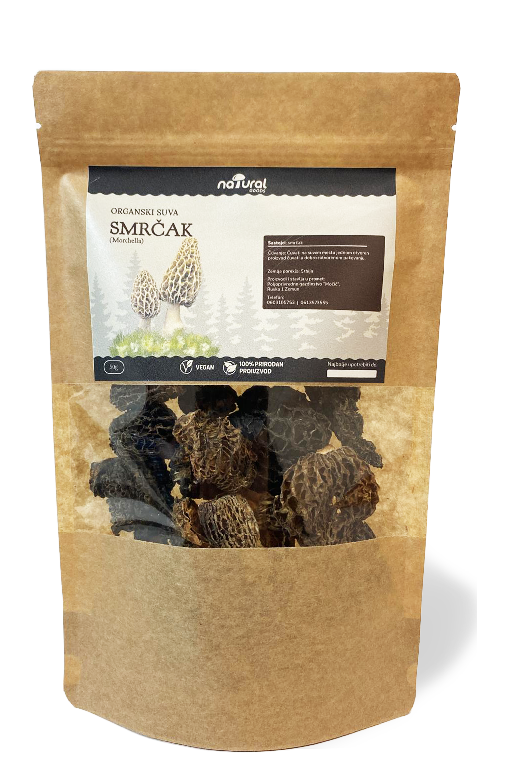 Suvi smrčak nastaje pažljivim procesom sušenja svežeg smrčka cenjene i retka šumske pečurke izražene arome i specifične strukture. Delikates koji jelima daje dubinu i prepoznatljiv gastronomski karakter, među pečurkama se smatra najluksuznijom posle tartufa.