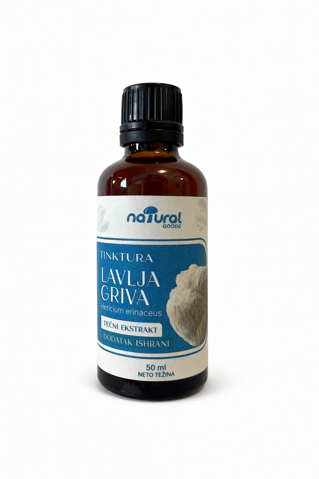 Natural Goods tinktura Lavlje Grive proizvodi se procesom kontrolisane ekstrakcije iz plodnog tela gljive, čime se omogućava koncentracija i stabilnost aktivnih sastojaka u tečnom obliku.