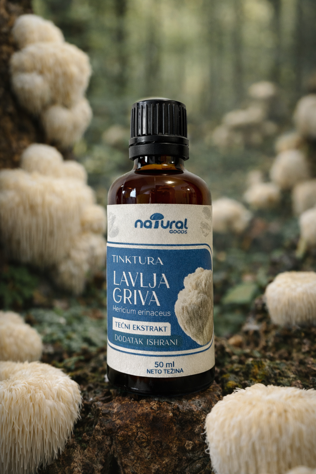 Natural Goods tinktura Lavlje Grive nastaje pažljivom ekstrakcijom odabranih plodnih tela, čime se čuvaju njene najvrednije bioaktivne komponente. U praktičnom obliku kapi, predstavlja jednostavan način da svakodnevno unesete prirodnu podršku za um, energiju i celokupno blagostanje